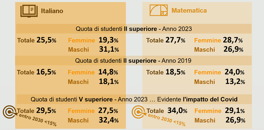 I risultati conseguiti dagli studenti delle scuole del Veneto sono tra i più alti in Italia: ai primi posti nelle competenze sia per i ragazzi di seconda superiore che di quinta, ma l'effetto della pandemia risulta evidente. Rispetto al 2019, più alte sono oggi le quote di ragazzi con scarse competenze e quindi con più alte perdite di apprendimento, portando anche un allontanamento dall'Obiettivo europeo dell'Agenda 2030 di un'istruzione di qualità per tutti in Italia. Tra i target, infatti, per raggiungere tale Obiettivo, anche quelli di non superare la quota del 15%, entro il 2030, di studenti 18-19enni con livelli insufficienti di competenza alfabetiche e numeriche.