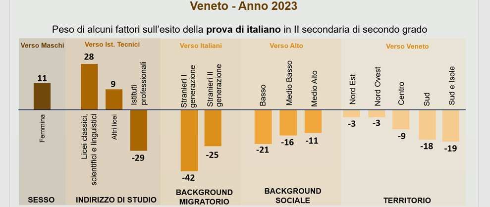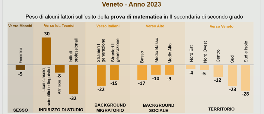 Ma cosa incide sui risultati degli studenti? In generale, si può considerare l'esito di una prova come effetto di diversi fattori, tra cui quelli relativi a variabili individuali (per esempio: il sesso, l'indirizzo di studio, il background migratorio e il contesto socio-economico e culturale della famiglia di provenienza) e alle caratteristiche dell'ambiente sociale in cui vive (come l'area geografica di residenza).