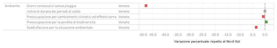 Le regioni del Nord d'Italia continuano ad avere livelli di benessere maggiori, seguono le aree del Centro quindi del Sud. Il Veneto presenta livelli di benessere generalmente superiori a quelli di diverse regioni e alla media nazionale. Riprendendo il lavoro di Istat, si propone il confronto tra il Veneto e la media delle regioni del Nord-Est (Trentino Alto-Adige, Veneto, Friuli-Venezia Giulia, Emilia-Romagna): ogni tessera della figura iniziale rappresenta un ambito di benessere equo e sostenibile.